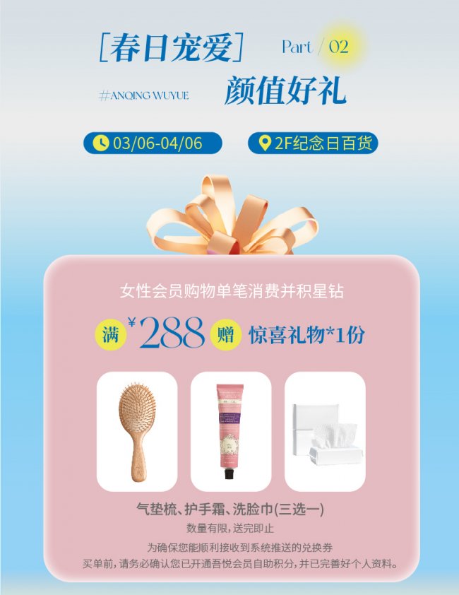 春日宠爱,致敬巾帼。结合春日氛围与女性需求,3月6日至4月6日,广场2F纪念日百货特别推出「颜值好礼」专属活动。活动期间,女性会员单笔消费并积星钻满288元,即可获赠气垫梳、护手霜或洗脸巾三选一的贴心好礼,以细腻关怀致敬每一位独立闪耀的女性,让春日的温暖与宠爱触手可及,传递新时代女性力量。