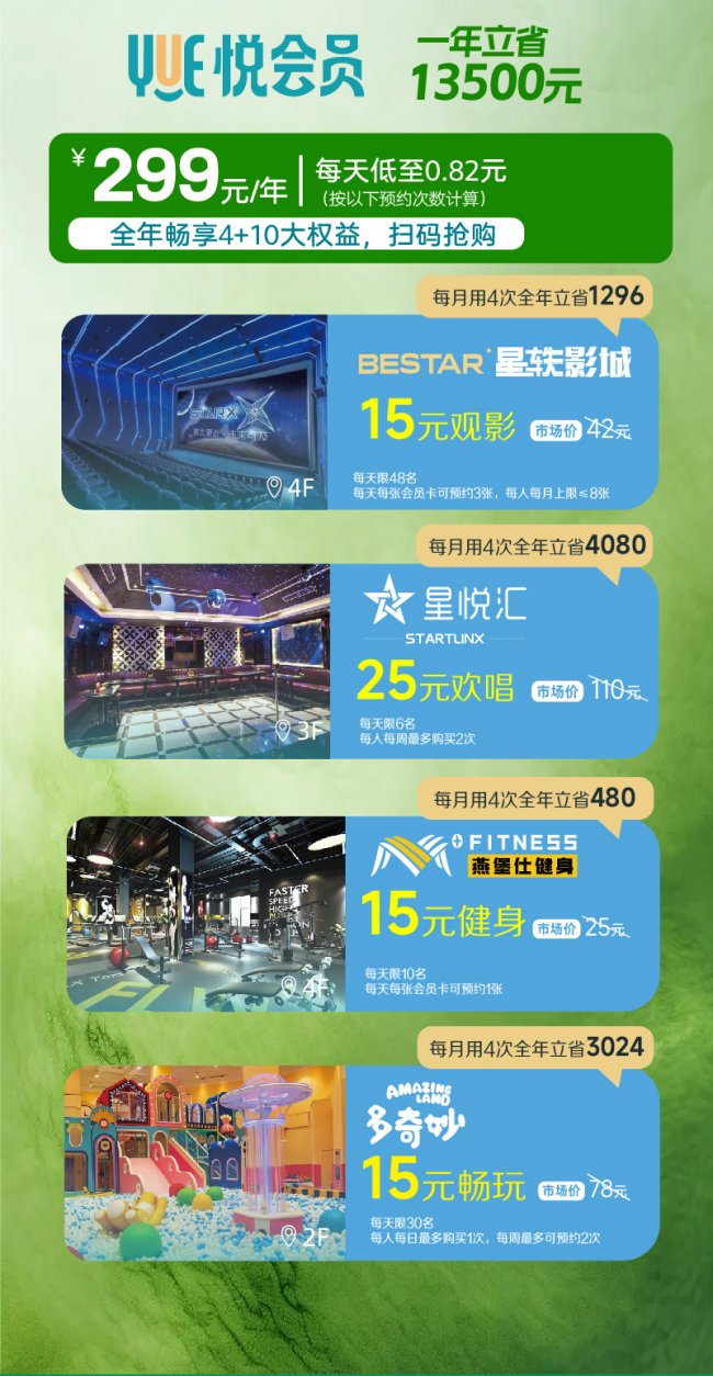 值得关注的是,本次活动期间,安庆吾悦广场悦会员推出超值权益,299元/年的会员费,每天低至0.82元,全年可畅享4+10大核心权益。其中,星轶影城15元观影、星悦汇25元欢唱、燕堡仕健身15元健身、多奇妙15元畅玩,四大核心权益全年可立省13500元,权益数量有限,先到先得,具体规则以现场及小程序公示为准。